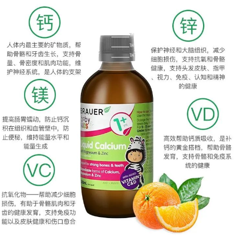 而Brauer家钙剂不仅含有更好吸收的微囊化钙,还含有甘氨酸锌,柠檬酸镁、维生素D和维生素C五种营养成分,婴幼儿成长发育所需的综合营养它都包含了,维生素C还能同时提升宝宝的免疫力。