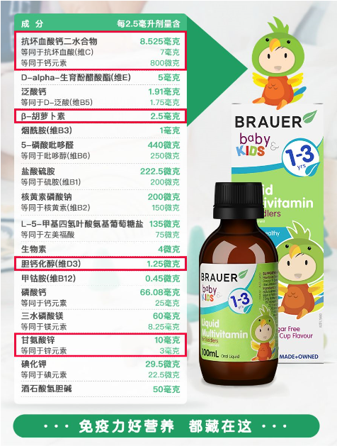 大家知道维生素A补充过量很容易中毒。Brauer产品里的维生素A用了β-胡萝卜素代替了棕榈酸维生素A,它可以在人体能转化为维生素A,并且是按需转化,不会造成维生素A补充过量,小孩子吃我们更放心。