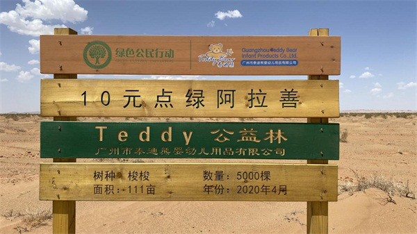 2020年3月,泰迪熊纸尿裤携手中国绿化基金会,正式启动了“Teddy植春萌动”公益活动,旨在传播绿色环保公益正能量,呼吁更多人加入植树公益,用行动绿化沙漠,共同守护地球家园。