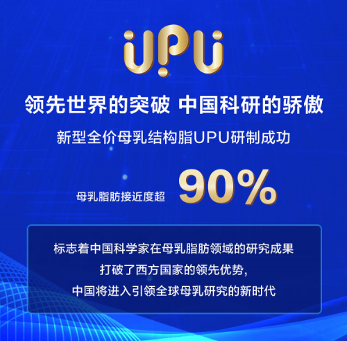 通过联合攻关,在对国内外的母乳脂肪样本进行分析研究后,开发出了新型全价母乳结构脂UPU,这种结构脂考虑了脂肪组成和结构,在比例上也和母乳更接近,其与母乳脂肪的总体相似程度达到了90%以上,位居世界前列。