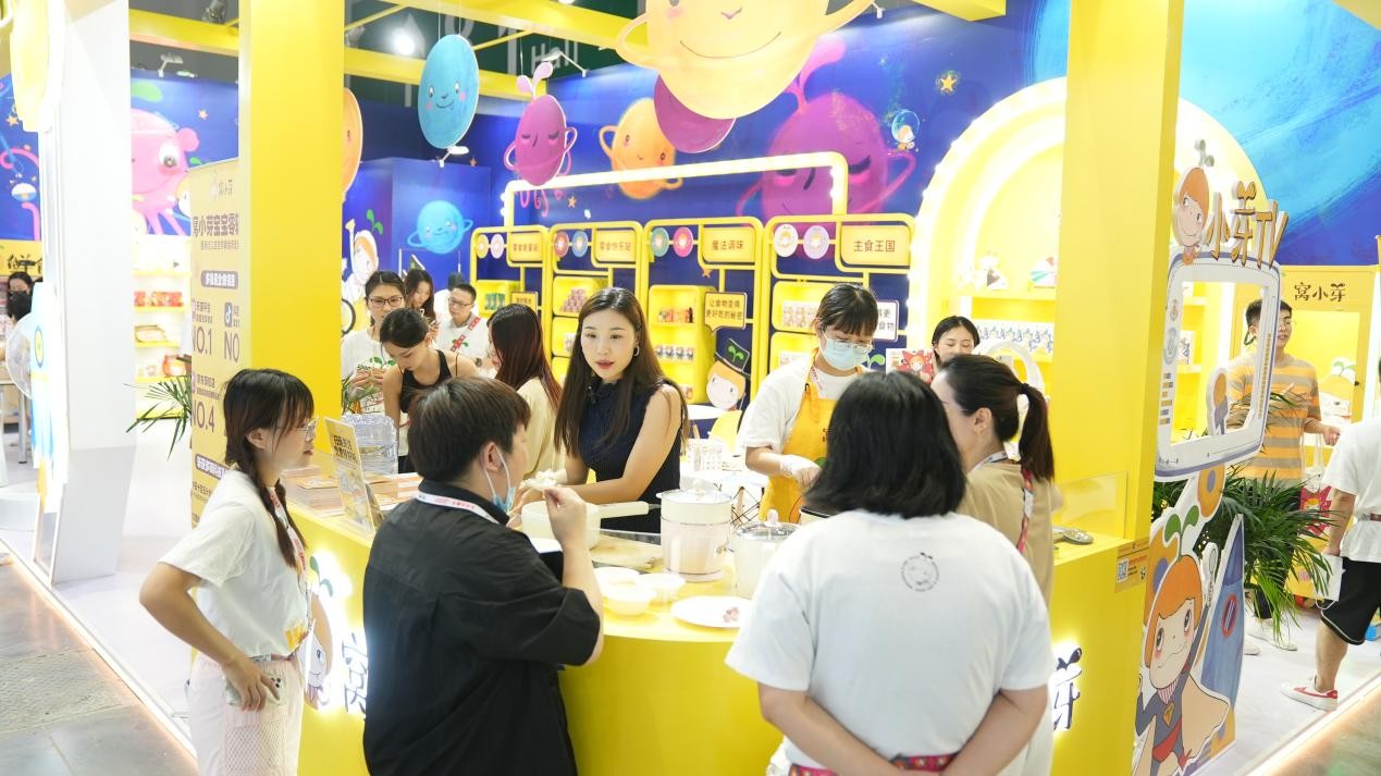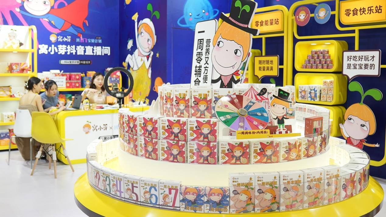 走近窝小芽展台,明黄色的背景墙加上随处可见的窝小芽IP形象,十分吸睛,展台内的游戏区、试吃区更是络绎不绝,并吸引了瑞雪妈妈、年糕妈妈等知名达人打卡。