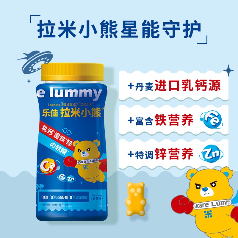 今年重新上市的乐佳拉米小熊软糖,有钙铁锌营养的健骨系列,和维生素C、接骨木莓、益生菌营养的免疫系列,外形包装时尚,Q弹口感,3岁以上人群可以放心食用。