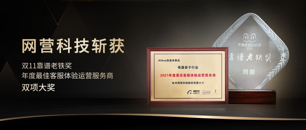 近日,网营科技凭借在母婴行业优异表现和突出运营服务等综合实力,获得由天猫颁发的“2021双11母婴行业靠谱老铁奖”和“2021年度最佳客服体验运营服务商”等双项嘉奖,且这两项大奖全行业仅网营一家摘得。