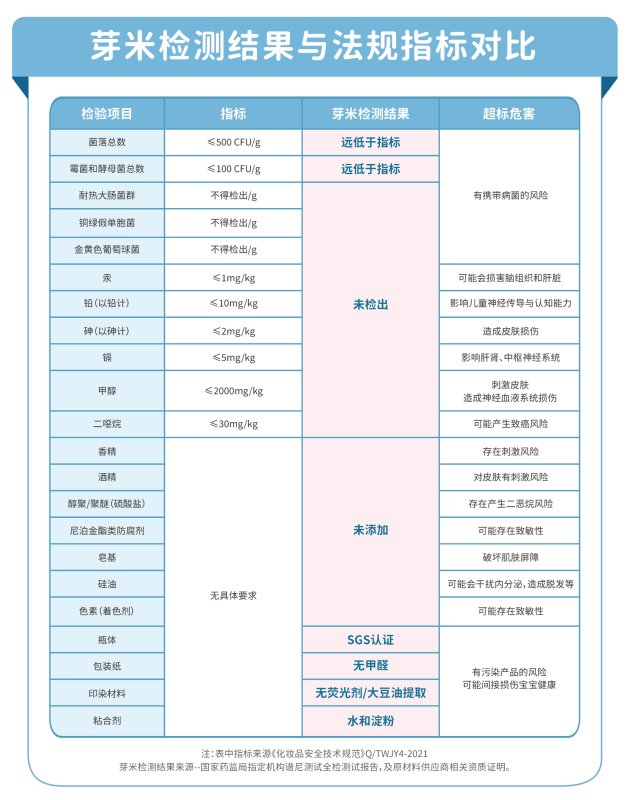 当然法规的要求,只是行业和产品的标准。而芽米婴童沐浴露一贯以“追求极致安全”为出发点,始终以高于国家/行业标准严格要求自己。不仅在原料及配方上严控品质,包装印染等细节也同样注重安全。
