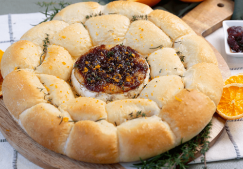 卡门贝尔花环配料:1新奇士脐橙、8 盎司罐装果冻蔓越莓酱、1/2茶匙红辣椒片、1个卡门贝尔奶酪轮、1袋 25 盎司的帕克豪斯风格面包卷冷冻面团,解冻、1根迷迭香,用作装饰、1根百里香,用作装饰