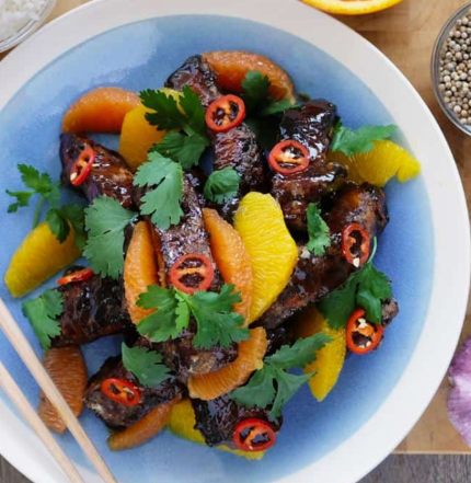 配料:2架猪排骨,约5磅、12 个新奇士脐橙,去皮榨汁,约 3 杯、1头大蒜、1大块姜、2汤匙香料、3片干燥的薄柑橘皮、1汤匙芫荽籽、1汤匙甜椒,磨碎并烤、1/2杯海鲜酱、1杯生抽、1杯红糖、2 个苏格兰帽辣椒,整个、2杯通用面粉、1杯玉米淀粉、油、2 个新奇士红肉橙子,去皮并切段、1/4杯香菜、1个红辣椒