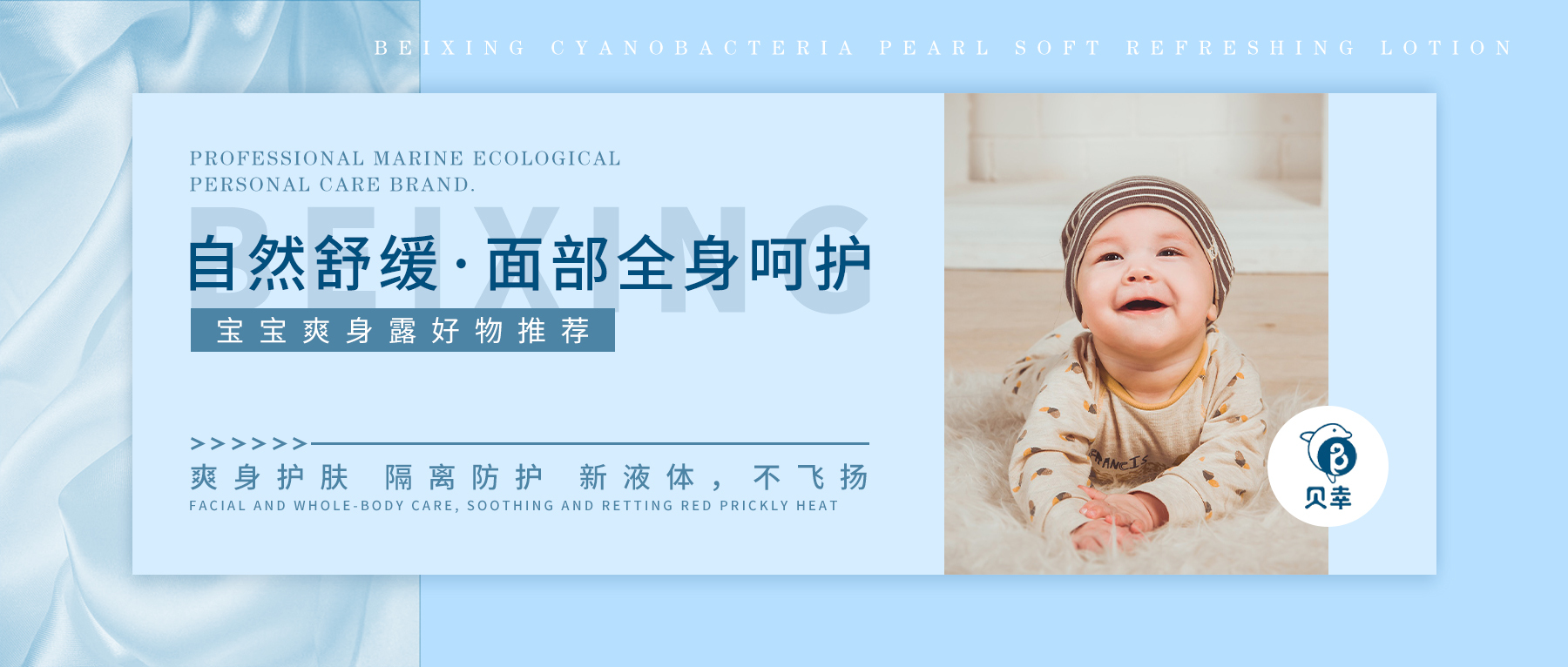 贝幸蓝藻珍珠柔呵爽身露,凝露质地,水感透气,易涂抹秒吸收,润肤不黏腻,于肌表形成薄膜,告别传统飞粉。柔和细腻,层层润透,帮助吸附多余水分和汗水,舒缓肌肤热痱红痒,柔护舒爽肌肤,安抚宝宝烦躁情绪。蕴含蓝藻、珍珠蛋白、库拉索芦荟等精华成分,柔滑舒适,弱酸不刺激,接近宝宝肌肤PH值,臻护肌肤,令肌肤更细嫩柔滑。