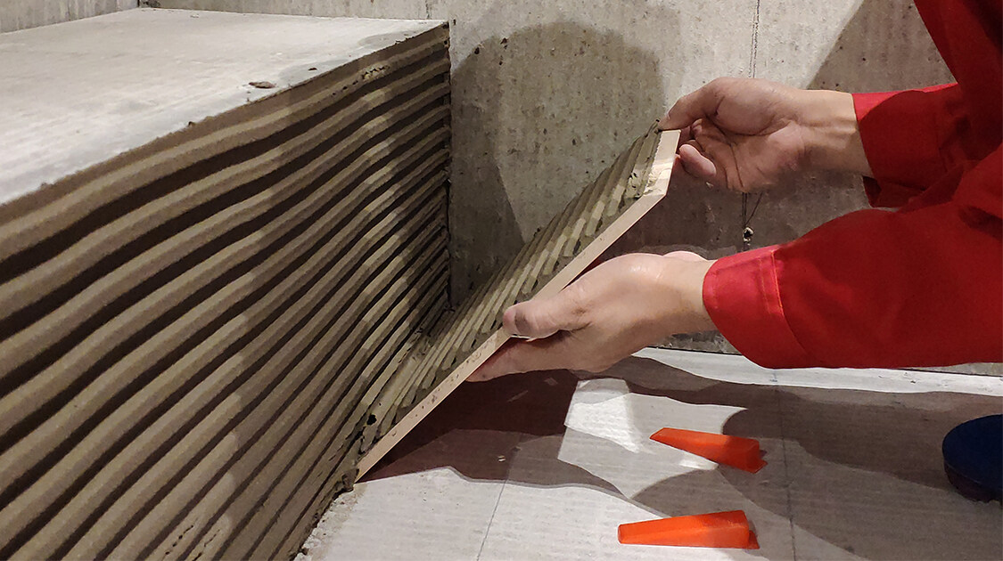 在选完瓷砖胶品牌之后,还需根据瓷砖尺寸来选择合适的瓷砖胶产品。尺寸大的瓷砖应该选择粘结力强的瓷砖胶。我们可以通过看执行标注判断瓷砖胶的粘结力。一般而言,执行JC/T 547-2017《陶瓷砖胶粘剂》C2标准的瓷砖胶可以满足大板瓷砖的铺贴需求,推荐雨虹C500超柔大板瓷砖胶,粘结强度高达1.9-2MPa(实验室标准测试),最大可以贴1200mm×2400mm的瓷砖。