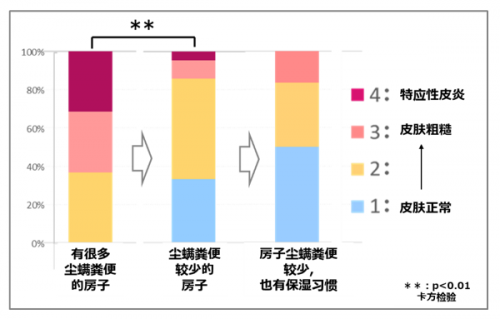 此外,当着眼于室内灰尘中存在的过敏原时,我们发现当尘螨粪便产生的过敏原量较小时,皮肤状况良好或皮疹较轻,而当尘螨粪便产生的过敏原量大,皮肤状况较差(图2左侧和中间)。这表明,尘螨粪便产生的大量过敏原是导致皮肤状况恶化的一个因素。