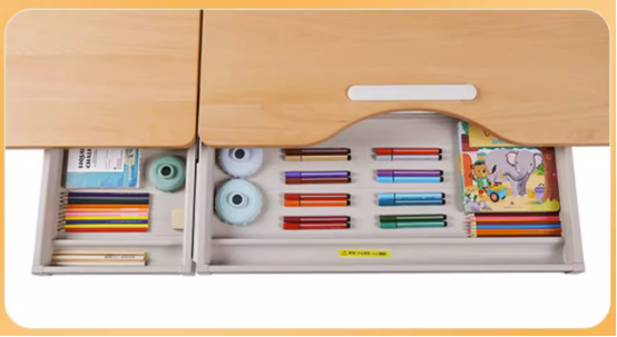 光明园迪Y6系列学习桌取消了托肘板设计,采用可拆卸式挡尺,扣式的拆装设计拆卸非常方便,桌垫通过挡尺卡装,对桌面进行全面保护,不易掉落而且可轻易取下,便于清理桌面,也可以根据自己的喜好更换颜色,长久保持新鲜感;可拆卸挡尺的设计让孩子在使用倾斜桌面写字、看书时,书本不易滑落。同时,桌面更加简洁大气,使用空间更大,配备桌面垫板的使用,肘部更加舒适,写字更加温润。