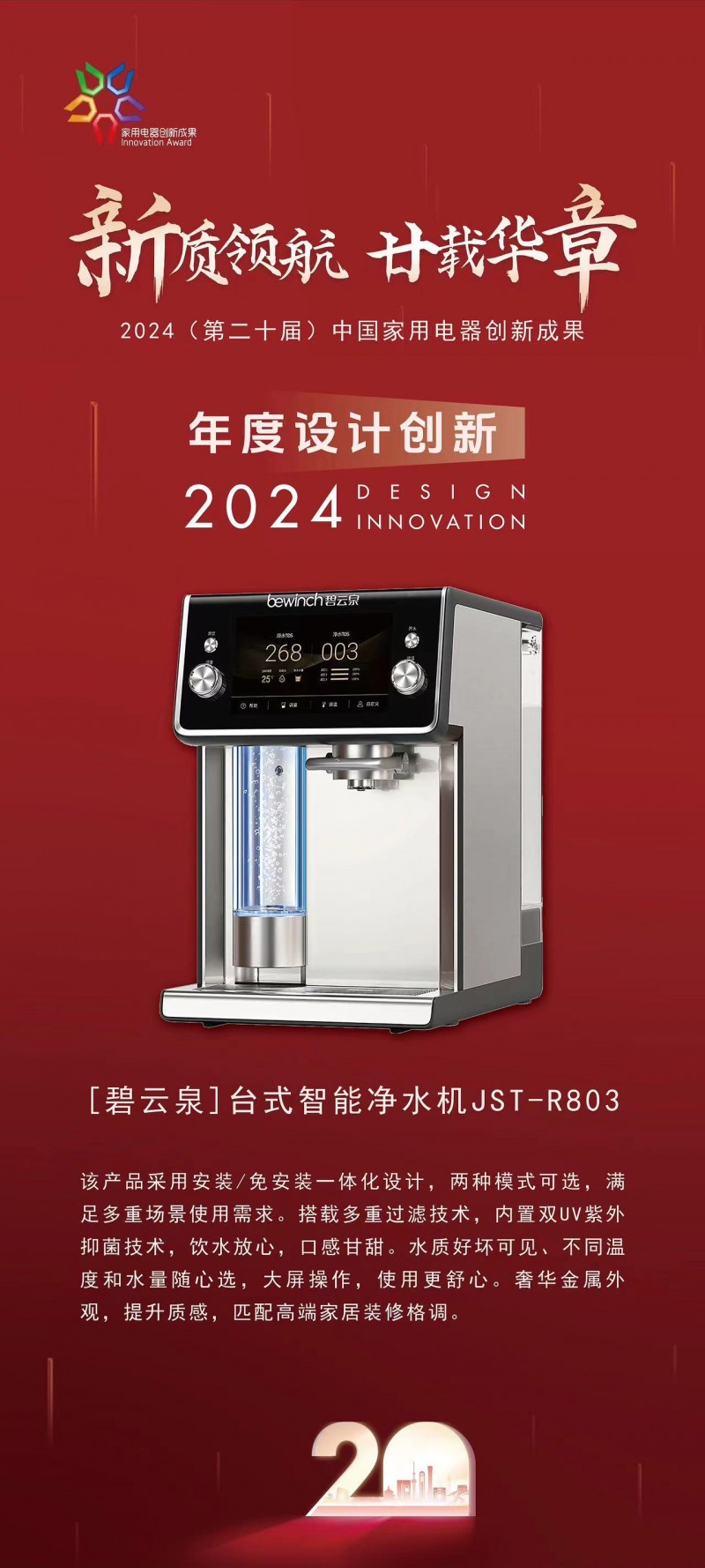 在净水领域,碧云泉Bewinch作为莱克电气旗下的高端净水品牌,始终站在行业前沿,以先进的制造工艺和研发技术,为中国用户带来高质量、高技术含量的净水解决方案。在刚刚结束的2024年(第二十届)中国家用电器创新成果评选中,碧云泉再次凭借JST-R803台式智能净水机荣获“年度设计创新”奖项,这不仅是对其创新能力的肯定,更是对品牌实力的彰显。