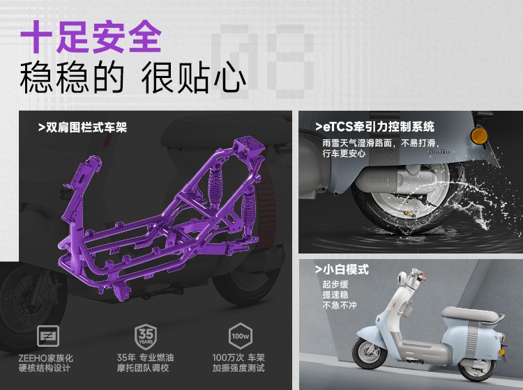 相对于同级产品,极核MO1针对女性出行需求进行定向调校,搭载小白模式,峰值功率达1400W,动力输出更加强劲,但起步提速更加平顺柔和,更加符合女性用户操控习惯,同时搭载ETCS牵引力控制系统,雨雪天气湿滑路面不易打滑,而极核家族化的双肩围栏车架,也让车辆更加牢靠耐用。
