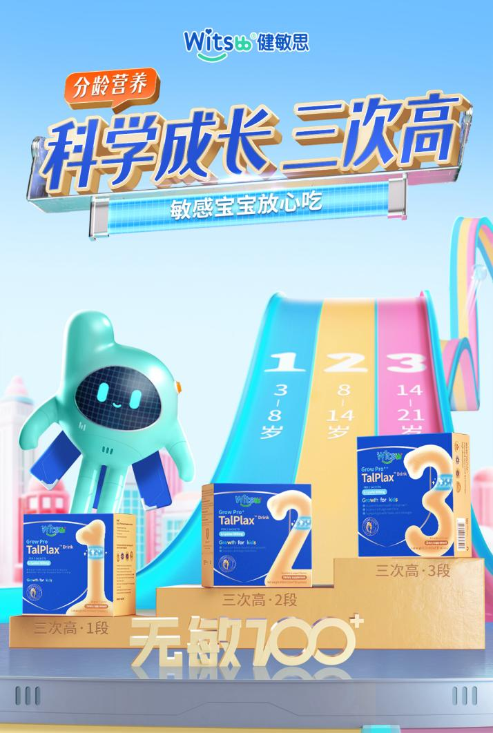 例如健敏思今年推出的重磅新品三次高系列,创新性提出"三阶模型"科学分龄理念,打破了传统婴童营养“一刀切”的补充模式。三次高将儿童的成长解构为动态系统工程,3-8岁黄金期,8-14岁猛涨期,14-21岁冲刺期,根据儿童三个不同的生理阶段的生长特性,提供分龄定制的精准营养方案,更好地激发生长潜力,帮助儿童科学追高。