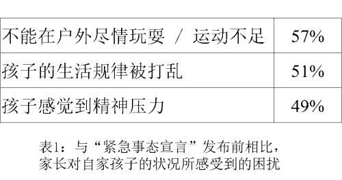 对家长的自由回答形式的问卷还调查了与“紧急事态宣言”发布前相比,家长对自家孩子的状况所感受到的困扰。调查结果显示,除了活动量减少,将近一半的幼儿感到精神压力,或是生活作息不规律(表1)。并且,调查结果显示家长自身也感受到了压力。