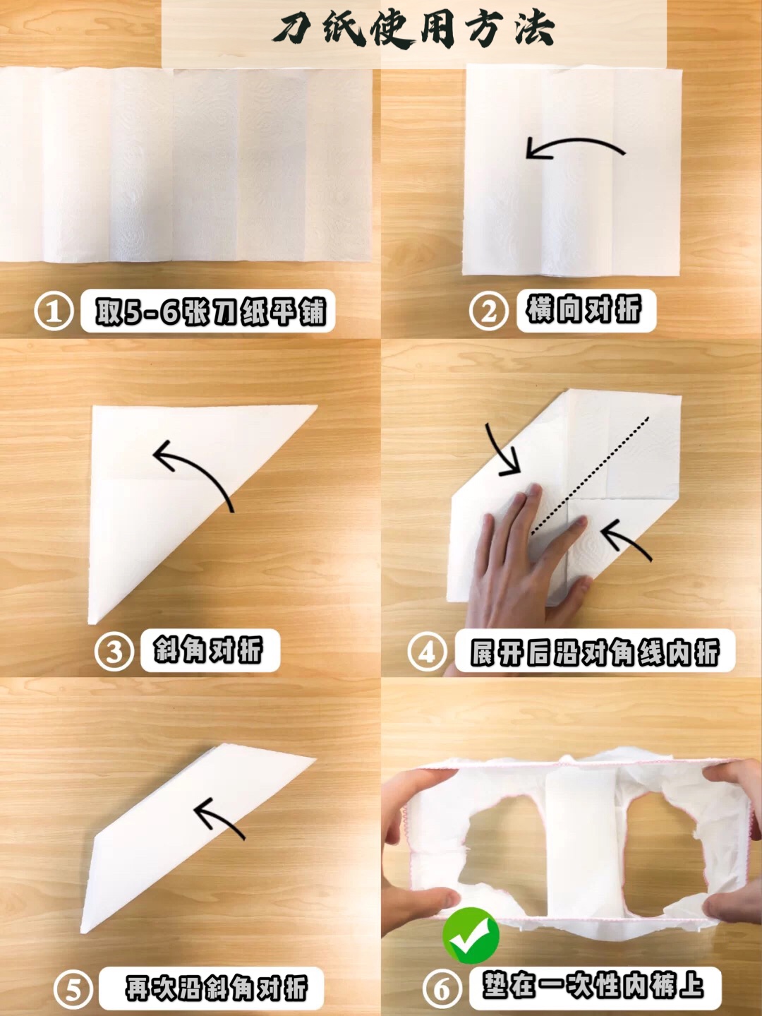 取出5-6张刀纸,平铺后先横向对折,再斜角对折,展开后沿对角线对折,之后在沿对斜角对折,便可以垫在一次性内裤上啦,“手残党”也能学会哟!