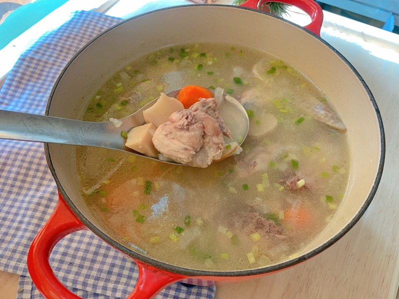 5.加入1,500c.c.的水,以大火煮滚后,捞出表面的浮沫与鸡油。