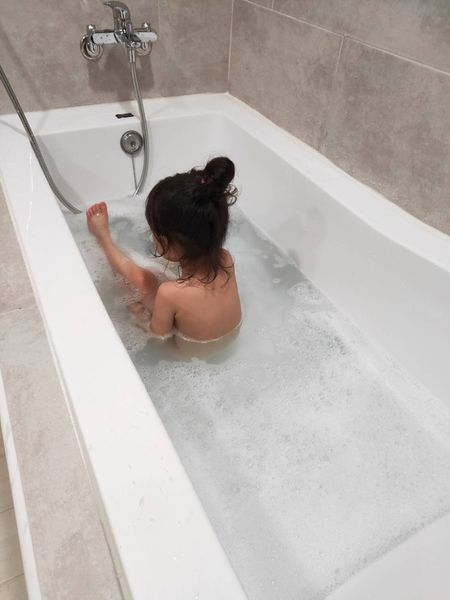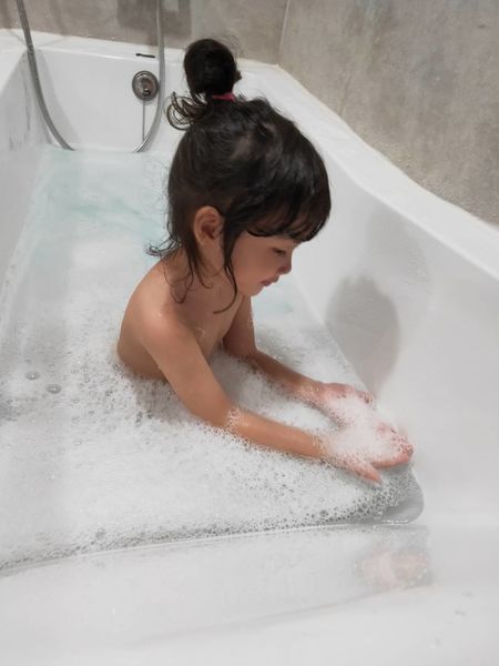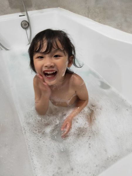天然的泡泡不刺激很安心,就让小孩多玩一些时间。(此时妈妈可以先闭上眼睛享受泡澡的时刻)